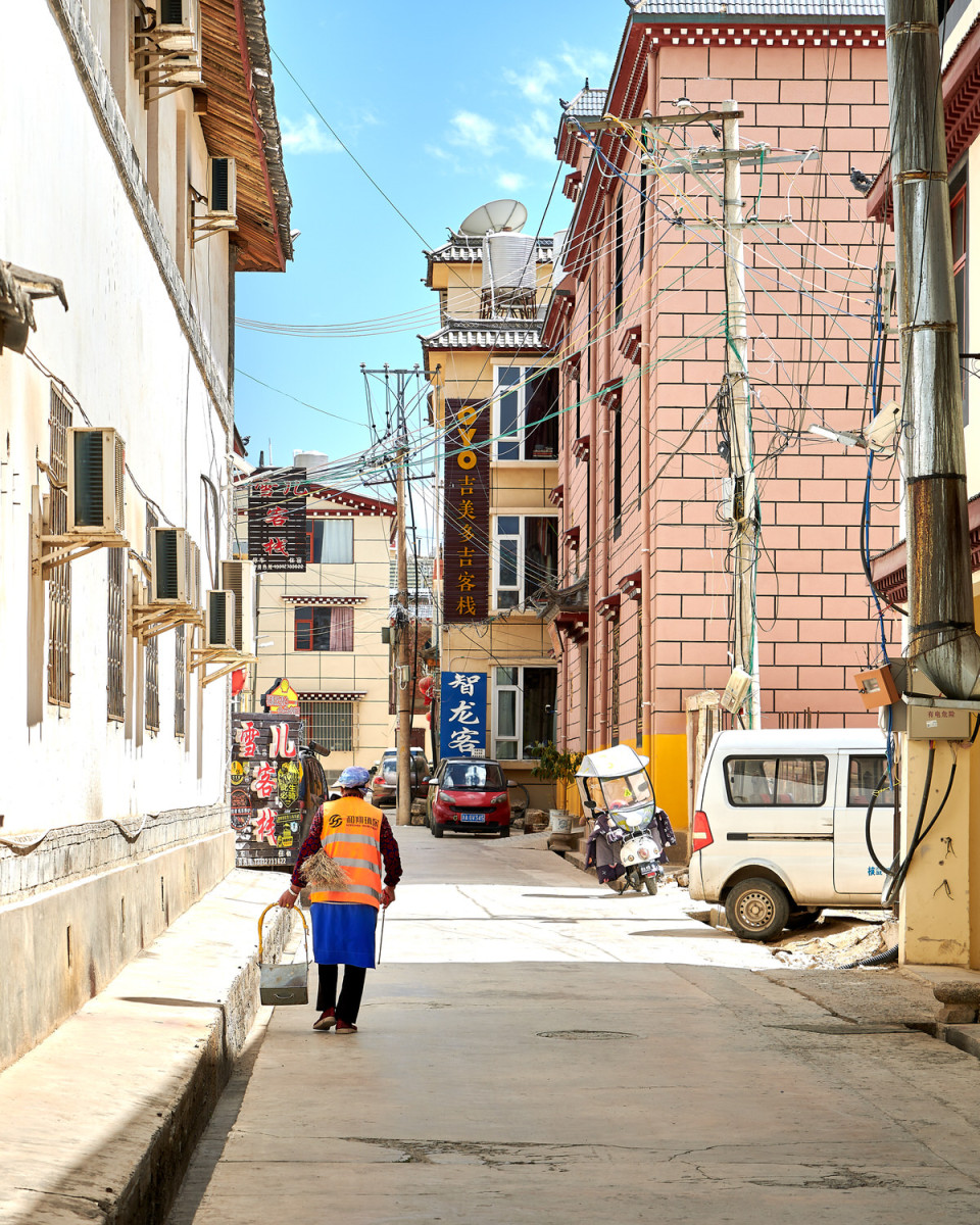 We arrived in Lijiang by train, joining a queue of passengers at the station exit where IDs — passports in my case — were scanned before we could leave. Our driver dropped us at the edge of Lijiang Old Town, where motor vehicles are not allowed. From there, hotel staff carried our luggage through winding cobblestone streets and up the hill to our room, which rewarded us with a magnificent view.