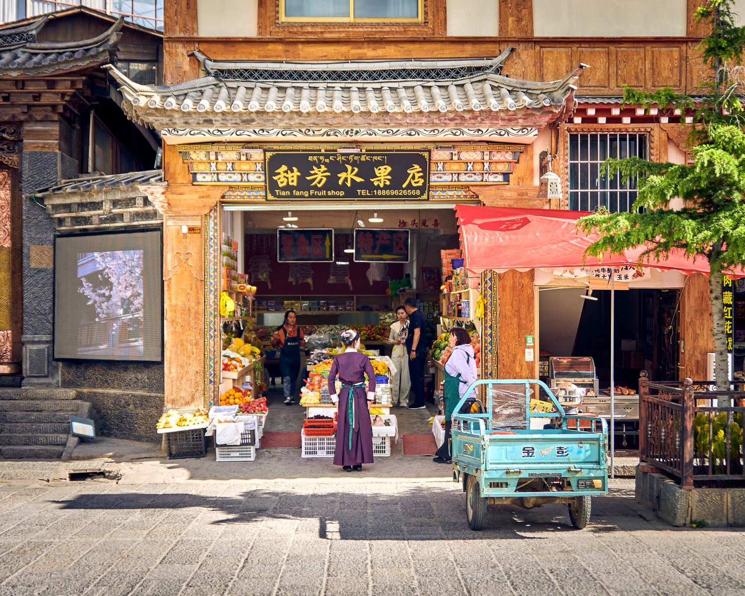 While Dali had a bohemian feel and Lijiang’s ancient town leaned heavily commercial, Shangri-La offered an entirely different atmosphere. It felt less touristy and far more grounded and earthy. The elevation rose dramatically from Lijiang, and the colors intensified along with it. A brilliant blue sky created striking contrast against the golds, reds, and other ornate architectural accents. Visiting Songzanlin Monastery was especially memorable—we passed through prayer rooms where monks gathered, then climbed winding staircases to the top, where we were rewarded with a stunning panoramic view of Shangri-La city.