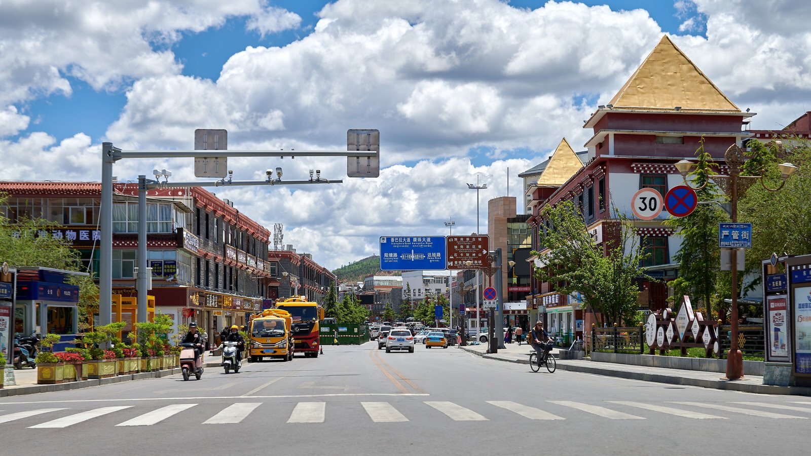 While Dali had a bohemian feel and Lijiang’s ancient town leaned heavily commercial, Shangri-La offered an entirely different atmosphere. It felt less touristy and far more grounded and earthy. The elevation rose dramatically from Lijiang, and the colors intensified along with it. A brilliant blue sky created striking contrast against the golds, reds, and other ornate architectural accents. Visiting Songzanlin Monastery was especially memorable—we passed through prayer rooms where monks gathered, then climbed winding staircases to the top, where we were rewarded with a stunning panoramic view of Shangri-La city.